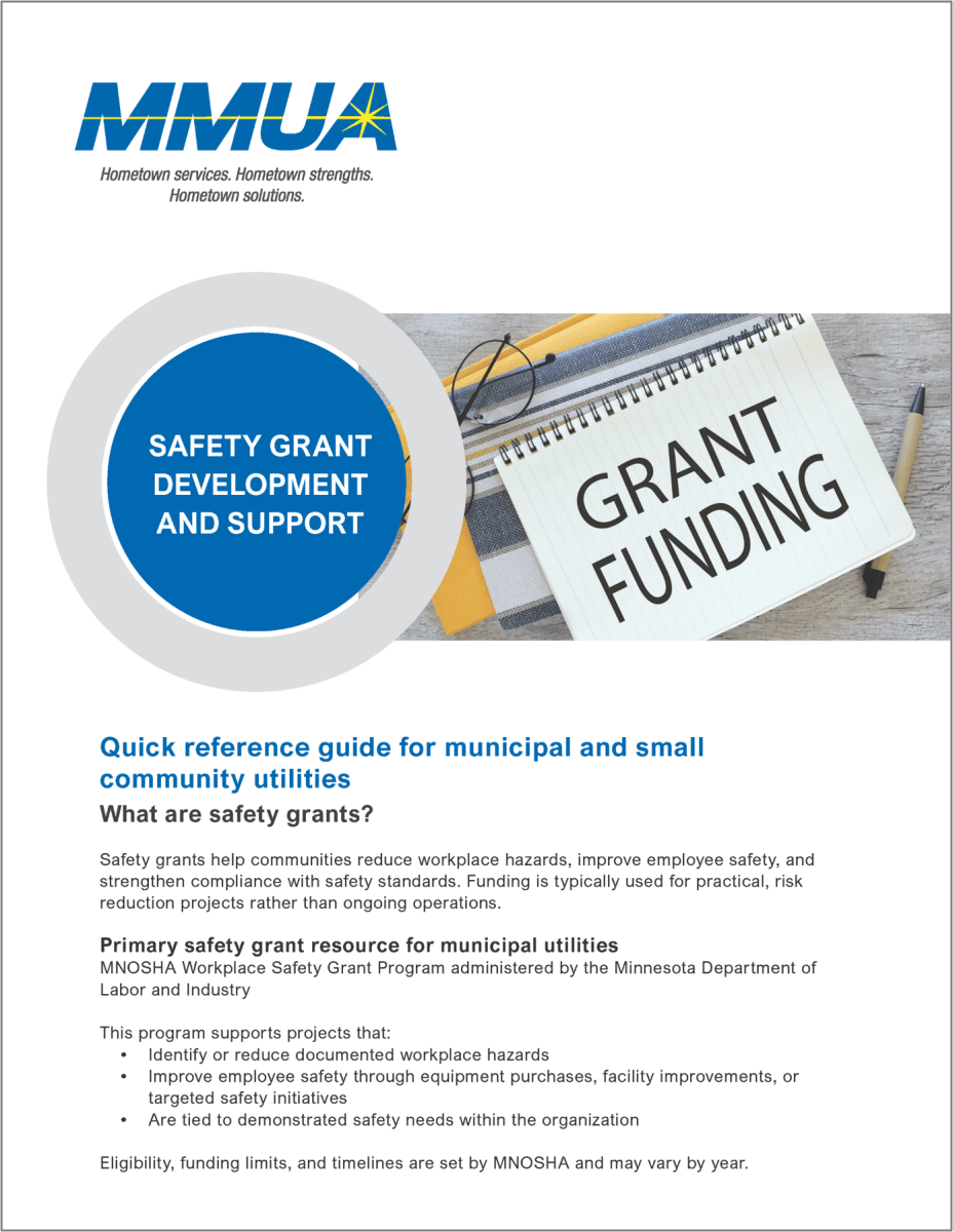 MMUA does not have the resources to write grants for all its members. We do have a staff that is knowledgeable about grant-seeking, and we are eager to help you with the grants you are interested in pursuing. For assistance, contact Karleen Kos.